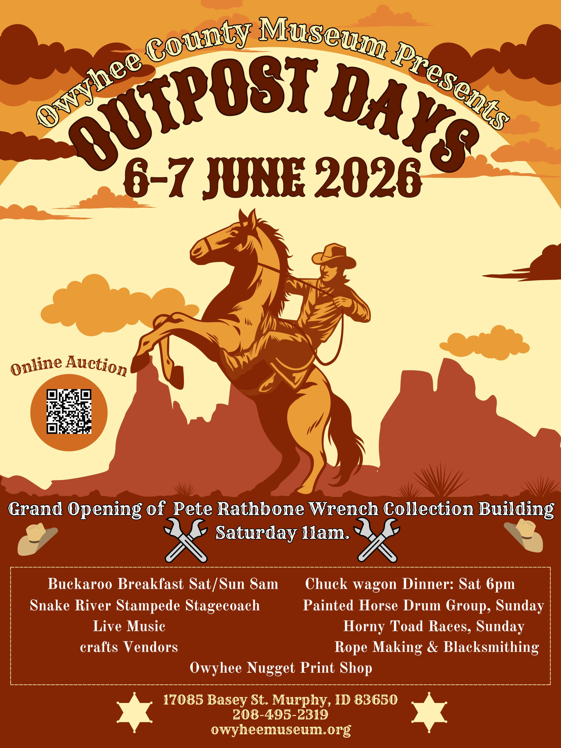 Come spend the day with the family and enjoy the old west the right way here at the Owyhee County Museum. More information can be found on our website under Outpost Days tab at the top.